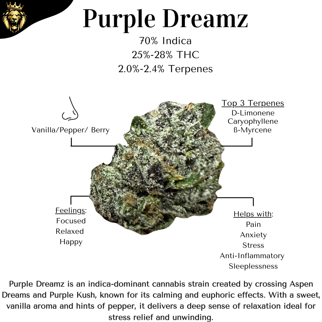 Purple Dreamz by Apex Cannabis Company is a premium indica-dominant hybrid flower, meticulously crafted for those seeking a harmonious blend of relaxation and mental clarity. This strain is a cross between Aspen Dreams and Purple Kush, resulting in a unique profile that caters to both recreational and therapeutic users.